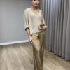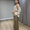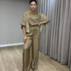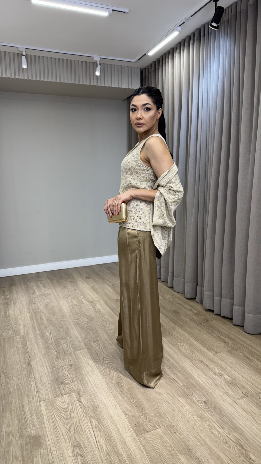 CALÇA PANTALONA PREGAS, DOURADO, ACETINADO, RETA