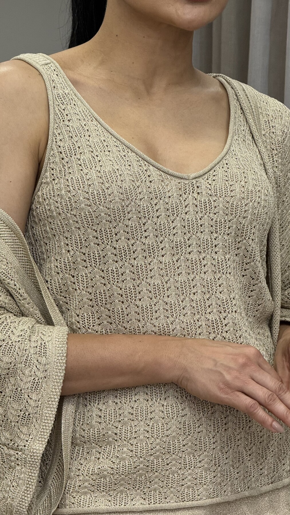 REGATA TRICO DOURADO FIO LUREX, TEXTURA, ALÇA LARGA